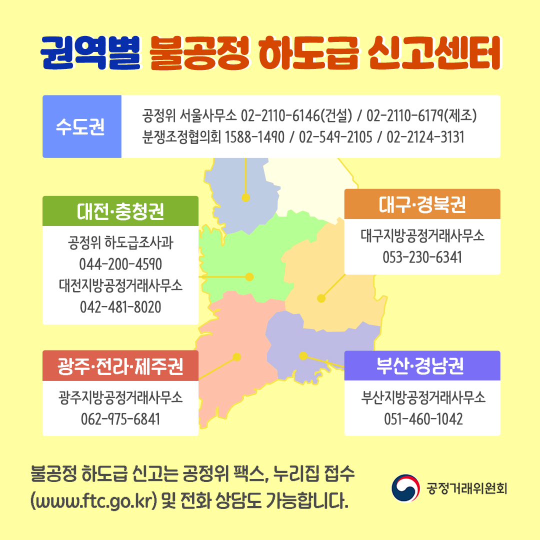 각 지역 공정거래위원회 사무소에서 대면 상담 및 신고가 가능합니다. 방문 전 예약을 통해 대기 시간을 줄일 수 있습니다.